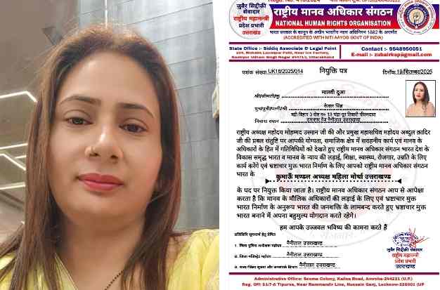 समाजसेवा के क्षेत्र में सक्रिय योगदान देने वाली प्रतिष्ठित सामाजिक कार्यकर्ता मालवी दुआ को राष्ट्रीय मानव अधिकार संगठन भारत के महिला मोर्चा, कुमाऊँ मंडल अध्यक्ष पद का दायित्व सौंपा गया है। यह नियुक्ति उनके सामाजिक सरोकारों, विशेषकर महिलाओं के अधिकारों और सशक्तिकरण के लिए किए गए कार्यों को ध्यान में रखते हुए की गई है।