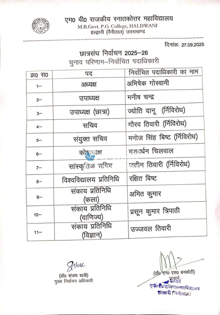 छात्रा उपाध्यक्ष पद पर ज्योति दानू निर्विरोध चुनी गईं, जबकि सचिव और संयुक्त सचिव पदों पर गौरव तिवारी और मनोज सिंह बिष्ट निर्विरोध निर्वाचित हुए। मुख्य निर्वाचन अधिकारी डॉ. संजय खत्री एवं प्राचार्य डॉ. एन. एस. बनकोटी ने बताया कि चुनाव पूरी तरह शांतिपूर्ण और पारदर्शी तरीके से संपन्न हुआ। सभी निर्वाचित पदाधिकारियों ने छात्र हित और कॉलेज के शैक्षणिक माहौल को बेहतर बनाने के लिए अपने प्रयास जारी रखने का संकल्प लिया।