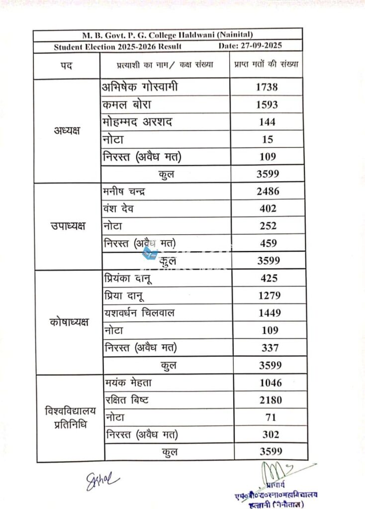 उपाध्यक्ष मनीष चन्द्र निर्वाचित हुए, जबकि अन्य पदों पर भी छात्रों ने निर्णायक चुनावी सहभागिता दिखाई। कुल 3599 मतदाता अपने मताधिकार का प्रयोग करने पहुँचे। चुनाव परिणामों के अनुसार, अध्यक्ष पद पर अभिषेक गोस्वामी ने 1738 मत हासिल कर कमल बोरा और मोहम्मद अरशद को पराजित किया। उपाध्यक्ष पद पर मनीष चन्द्र 2486 मत लेकर विजयी रहे। कोषाध्यक्ष के रूप में यशवर्धन चिलवाल, विश्वविद्यालय प्रतिनिधि के रूप में रक्षित बिष्ट निर्वाचित हुए।