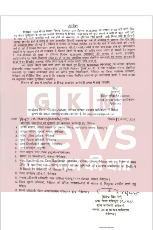 इसी को देखते हुए जिलाधिकारी ने मंगलवार, 12 अगस्त को जनपद नैनीताल के सभी शासकीय, अर्द्धशासकीय और निजी विद्यालय (कक्षा 1 से 12 तक) तथा सभी आंगनबाड़ी केंद्रों में अवकाश घोषित किया है।