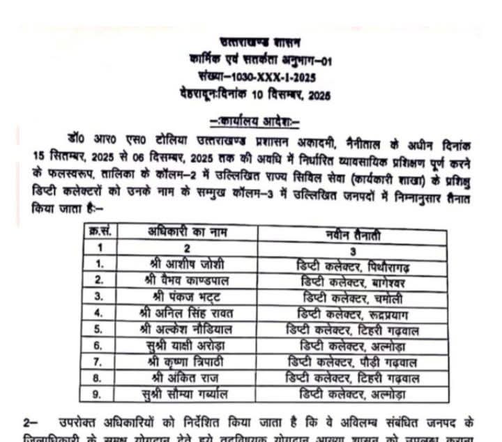 डॉ. आर. एस. टोलिया उत्तराखंड प्रशासन अकादमी, नैनीताल में 15 सितंबर 2025 से 6 दिसंबर 2025 तक व्यावसायिक प्रशिक्षण पूरा करने के बाद राज्य सिविल सेवा के 9 प्रशिक्षु डिप्टी कलेक्टरों को उनकी प्रथम तैनाती दे दी गई है। शासन ने सभी अधिकारियों को उनके गृह जनपदों से अलग जिलों में नियुक्त किया है।