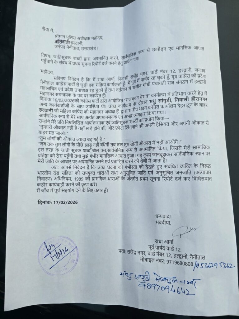 राधा आर्या ने कोतवाली हल्द्वानी में एस पी सिटी को लिखित शिकायत सौंपते हुए संबंधित धाराओं में एफआईआर दर्ज कर कड़ी कार्रवाई की मांग की है। शिकायत के अनुसार, 16 फरवरी को देहरादून स्थित कांग्रेस कार्यालय के बाहर आयोजित कार्यक्रम के दौरान उन्हें कथित रूप से “औकात” और “झाड़” जैसे शब्दों से सार्वजनिक रूप से अपमानित किया गया, जिससे उनकी सामाजिक प्रतिष्ठा को ठेस और मानसिक आघात पहुँचा।