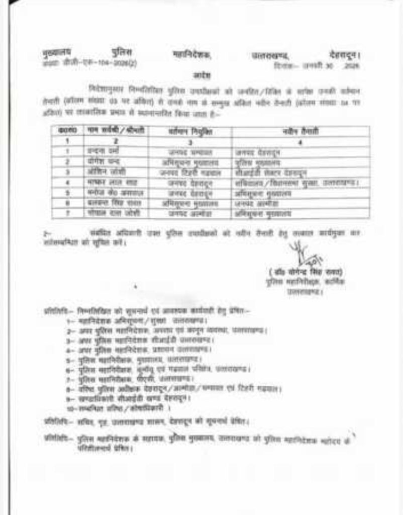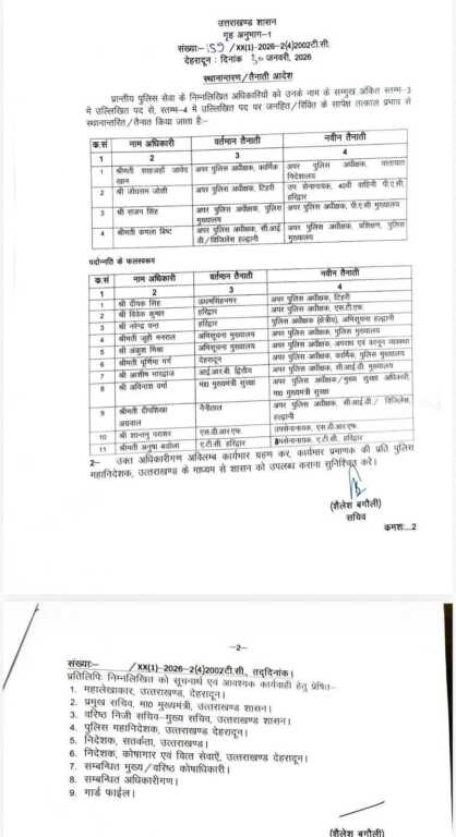 इस सूची में अन्य क्षेत्राधिकार अधिकारियों के भी तबादले किए गए हैं, जिनमें वंदना वर्मा, योगेश चंद, ओशिन जोशी, मनोज असवाल, बलवंत सिंह रावत,