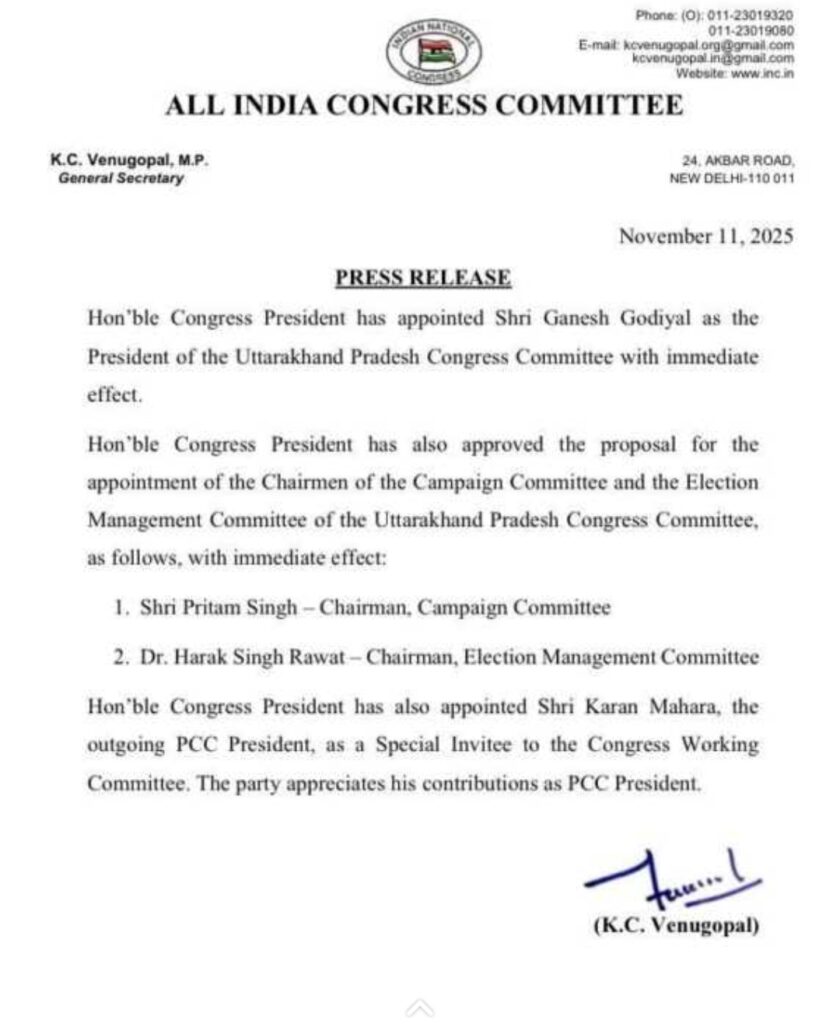देहरादून: उत्तराखंड की राजनीति से इस वक्त की बड़ी खबर सामने आई है। कांग्रेस हाईकमान ने तत्काल प्रभाव से गणेश गोदियाल को उत्तराखंड प्रदेश कांग्रेस कमेटी का नया अध्यक्ष नियुक्त किया है। पार्टी ने यह निर्णय संगठनात्मक मजबूती और आगामी चुनावी रणनीति को ध्यान में रखते हुए लिया है।