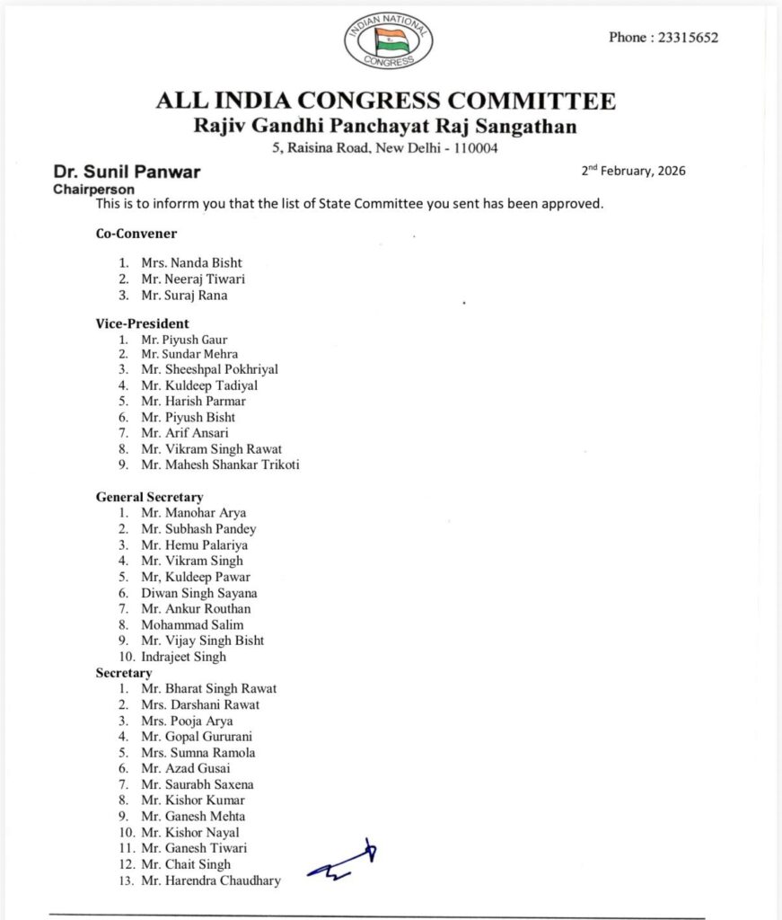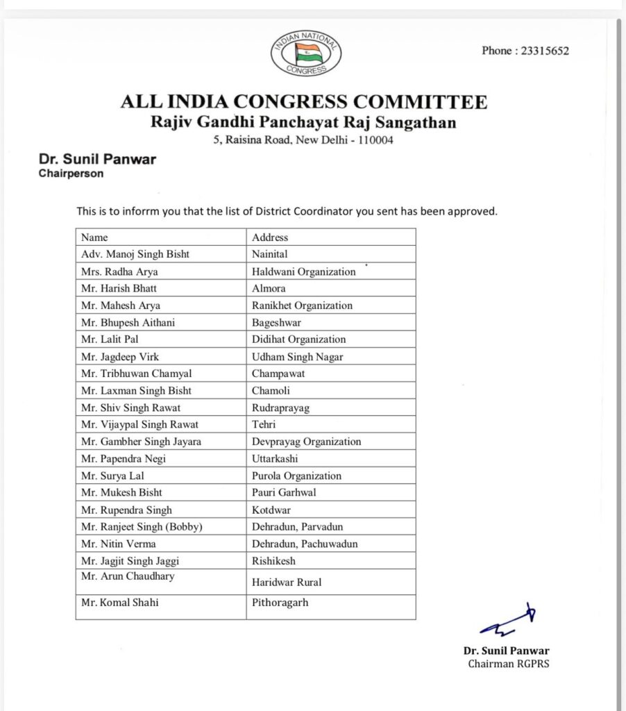 अखिल भारतीय राष्ट्रीय कांग्रेस ने वरिष्ठ कांग्रेसी नेता, उत्तराखंड राज्य आंदोलनकारी, पूर्व जिला पंचायत सदस्य एवं प्रदेश प्रवक्ता कांग्रेस नीरज तिवारी को राजीव गांधी पंचायती राज संगठन का कार्यवाहक प्रदेश अध्यक्ष मनोनीत किया है।