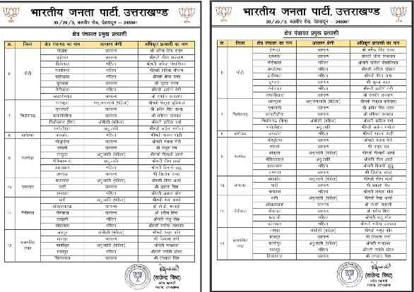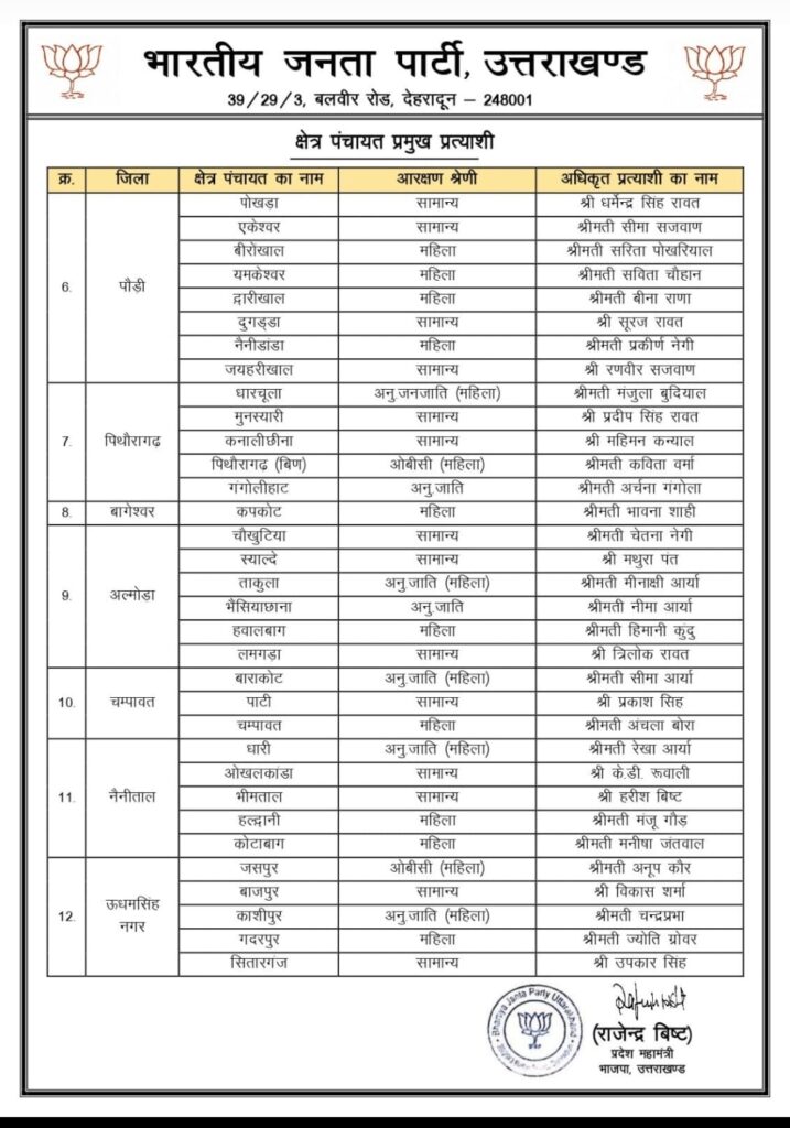 देहरादून। भाजपा ने प्रदेश की पंचायतों मे क्षेत्र पंचायत प्रमुखों के लिए अधिकृत प्रत्याशियों की प्रथम सूची जारी कर दी है।