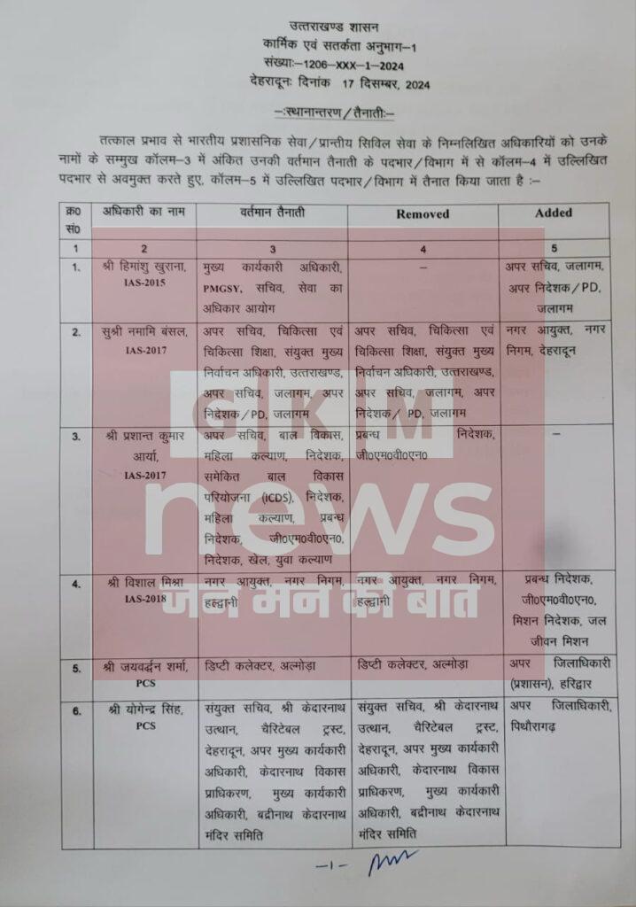BREAKING : उत्तराखंड में प्रशासनिक फेरबदल_ IAS -PCS के तबादले,ऋचा सिंह को हल्द्वानी..