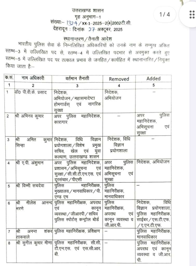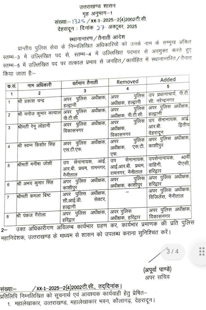 ASP हल्द्वानी में बदलाव- प्रकाश चन्द्र को ASP हल्द्वानी से हटाकर PTC नरेंद्रनगर भेजा गया। उनकी जगह मनोज कुमार कत्याल को नया ASP हल्द्वानी तैनात किया गया है।