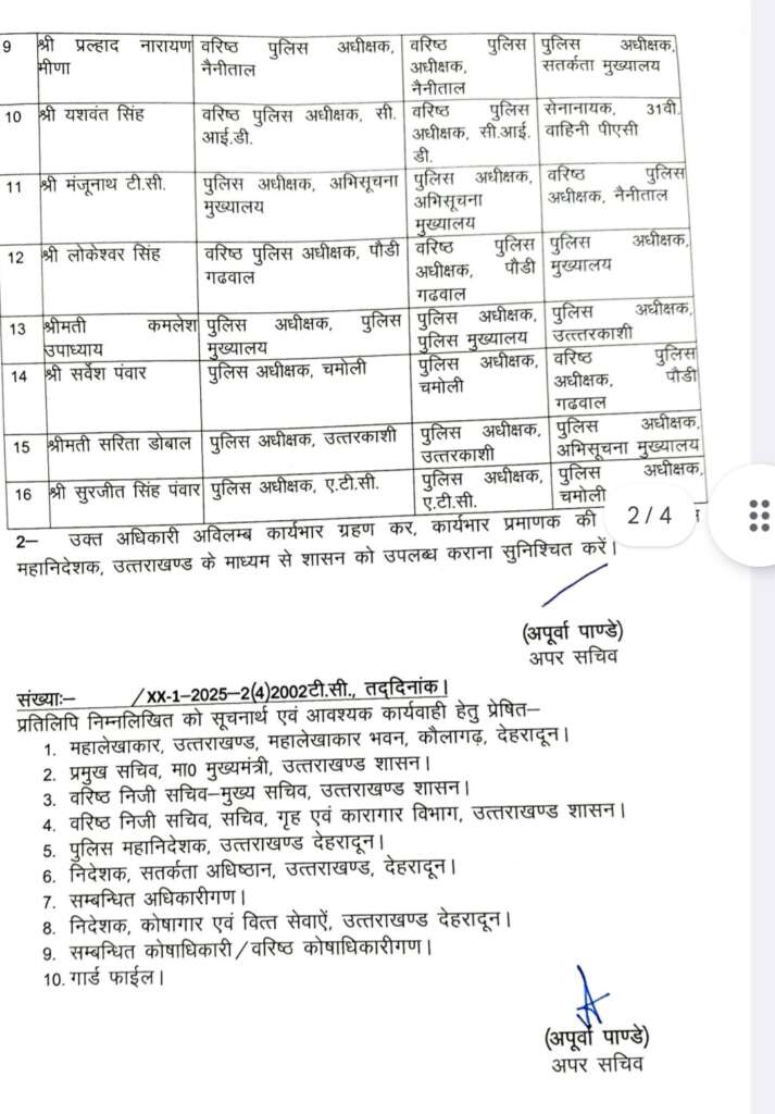 उत्तराखंड सरकार ने सोमवार देर शाम को 16 IPS और प्रांतीय पुलिस सेवा (PPS) के 8 अधिकारियों के ट्रांसफर कर दिए है। यह आदेश अपर सचिव अपूर्वा पाण्डे ने जारी किए है।