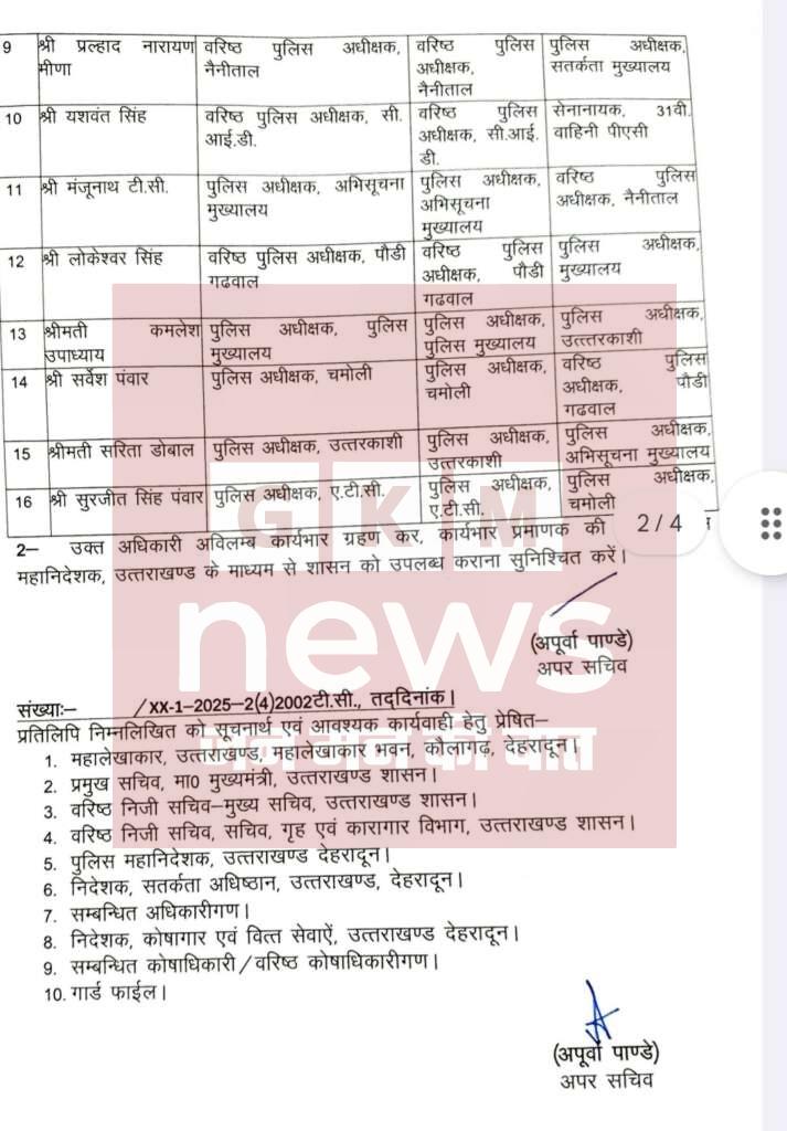 उत्तराखंड सरकार ने सोमवार देर शाम को 16 IPS और प्रांतीय पुलिस सेवा (PPS) के 8 अधिकारियों के ट्रांसफर कर दिए है। यह आदेश अपर सचिव अपूर्वा पाण्डे ने जारी किए है।
