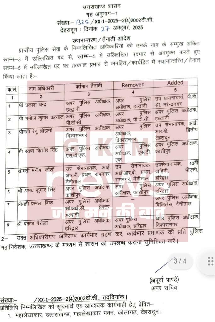 ASP हल्द्वानी में बदलाव- प्रकाश चन्द्र को ASP हल्द्वानी से हटाकर PTC नरेंद्रनगर भेजा गया। उनकी जगह मनोज कुमार कत्याल को नया ASP हल्द्वानी तैनात किया गया है।