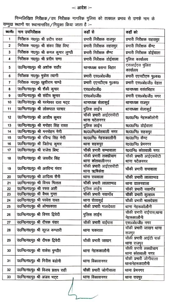 उत्तराखंड में पुलिस महकमे में एक बार फिर बड़े स्तर पर तबादले किए गए हैं। इस बार राजधानी देहरादून से अहम फेरबदल की खबर सामने आई है, जहां एसएसपी प्रमेंद्र डोभाल ने निरीक्षकों और उपनिरीक्षकों के व्यापक स्तर पर ट्रांसफर आदेश जारी किए हैं।