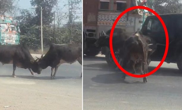 वीडियो में साफ दिखाई दे रहा है कि दोनों सांड तेज रफ्तार से एक-दूसरे पर हमला करते हुए सड़क के बीच आ गए। इसी दौरान वहां से गुजर रही एक थार कार उनकी चपेट में आते-आते बची। चालक ने सूझबूझ का परिचय देते हुए तत्काल ब्रेक लगाए, जिससे संभावित बड़ा हादसा टल गया। कार सवार सुरक्षित बताए जा रहे हैं।