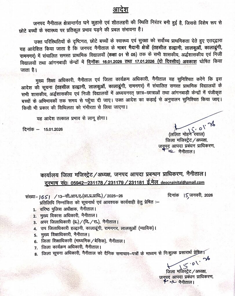 जनपद नैनीताल में लगातार बने घने कोहरे और शीत लहर को देखते हुए प्रशासन ने एहतियाती कदम उठाए हैं। छोटे बच्चों के स्वास्थ्य पर पड़ने वाले प्रतिकूल प्रभाव को ध्यान में रखते हुए भाबर क्षेत्र के चार तहसीलों – हल्द्वानी, लालकुआं, कालाढूंगी और रामनगर में दो दिन का अवकाश घोषित किया गया है।