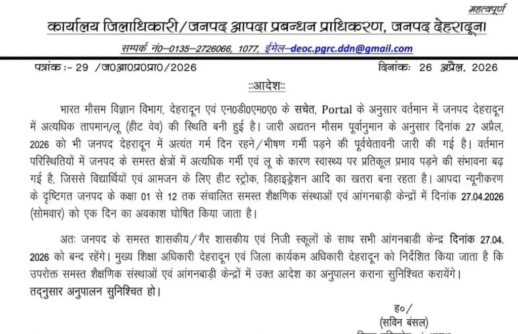 जिससे विद्यार्थियों एवं आमजन के लिए हीट स्ट्रोक, डिहाइड्रेशन आदि का खतरा बना रहता है। आपदा न्यूनीकरण के दृष्टिगत जनपद के कक्षा 01 से 12 तक संचालित समस्त शैक्षणिक संस्थाओं एवं आंगनबाड़ी केन्द्रों में दिनांक 27.04.2026 (सोमवार) को एक दिन का अवकाश घोषित किया जाता है।