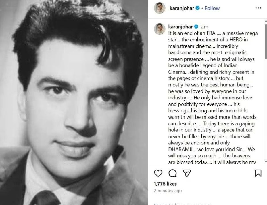 फिल्म डायरेक्टर करण जौहर ने इंस्टाग्राम पर धर्मेंद्र के निधन को लेकर पोस्ट किया, “यह एक युग का अंत है… एक बहुत बड़ा मेगा स्टार… मेनस्ट्रीम सिनेमा में एक HERO का रूप… बहुत हैंडसम और सबसे रहस्यमयी स्क्रीन प्रेजेंस… वह इंडियन सिनेमा के एक असली लेजेंड हैं और हमेशा रहेंगे… सिनेमा के इतिहास के पन्नों में खास और शानदार तरीके से मौजूद हैं…”