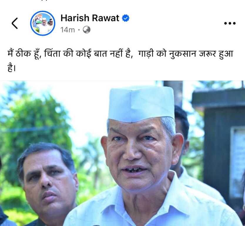 हरीश रावत ने सोशल मीडिया पर हादसे की जानकारी साझा करते हुए कहा, “मैं पूरी तरह से ठीक हूं, चिंता की कोई बात नहीं है। गाड़ी को जरूर नुकसान हुआ है, लेकिन मैं पूरी तरह स्वस्थ हूं।”