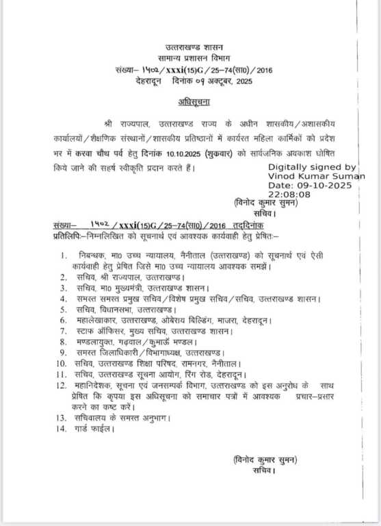 उत्तराखण्ड सरकार ने महिलाओं को करवा चौथ पर्व पर बड़ी राहत देते हुए 10 अक्टूबर 2025 (शुक्रवार) को राज्यभर के शासकीय/अशासकीय कार्यालयों, शैक्षणिक संस्थानों व शासकीय प्रतिष्ठानों में कार्यरत महिला कर्मचारियों के लिए सार्वजनिक अवकाश की घोषणा की है।