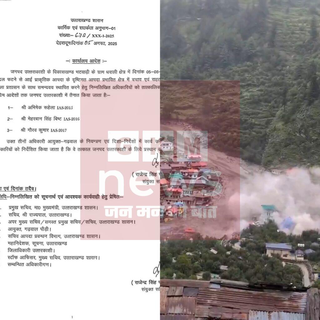 उत्तराखंड शासन ने जनपद उत्तरकाशी के विकासखंड भटवाड़ी के ग्राम धराली क्षेत्र में 5 अगस्त 2025 को अचानक आई प्राकृतिक आपदा के दृष्टिगत राहत एवं बचाव कार्यों को प्रभावी ढंग से संचालित करने के लिए तीन IAS अधिकारियों की तात्कालिक तैनाती के आदेश जारी किए हैं।