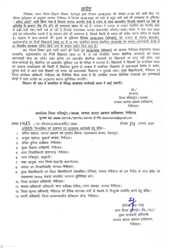 छात्र-छात्राओं की सुरक्षा को सर्वोच्च प्राथमिकता देते हुए जिला मजिस्ट्रेट/अध्यक्ष, जनपद आपदा प्रबंधन प्राधिकरण, नैनीताल वन्दना द्वारा दिनांक 25 अगस्त 2025 (सोमवार) को जनपद के समस्त शासकीय, अर्द्धशासकीय एवं निजी विद्यालयों (कक्षा 1 से 12 तक) तथा सभी आंगनबाड़ी केंद्रों में एक दिवसीय अवकाश घोषित किया गया है।