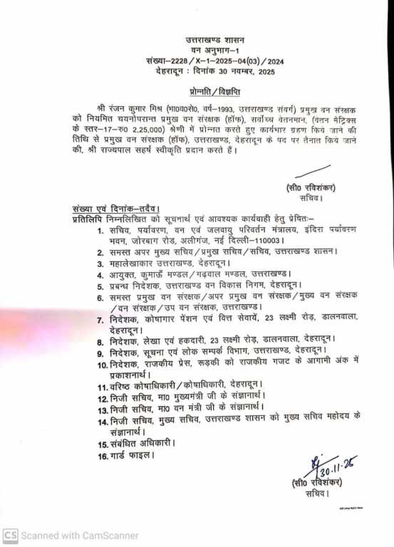उत्तराखंड सरकार ने 1993 बैच के भारतीय वन सेवा (IFS) अधिकारी रंजन कुमार मिश्र को राज्य का नया प्रमुख वन संरक्षक (हॉफ) नियुक्त किया है। राज्यपाल ने उनकी पदोन्नति को मंजूरी देते हुए उन्हें सर्वोच्च वेतनमान लेवल-17 (₹2,25,000) में तैनाती की स्वीकृति प्रदान की है।