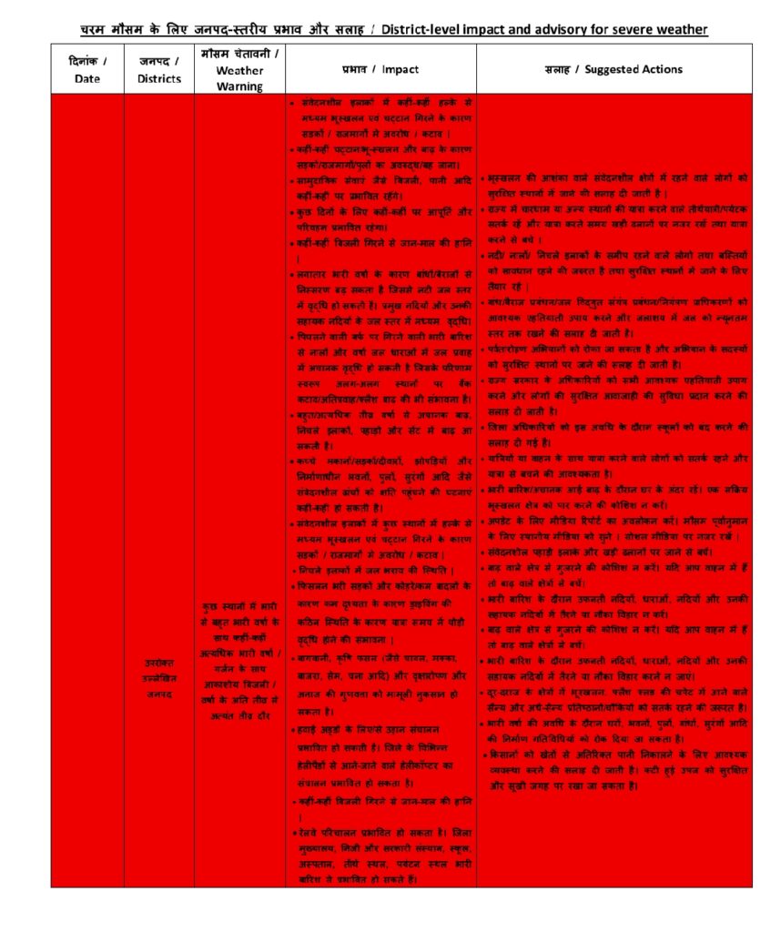 जिला मजिस्ट्रेट एवं अध्यक्ष, जिला आपदा प्रबंधन प्राधिकरण वंदना ने सभी संबंधित विभागों को हाई अलर्ट पर रहने के सख्त निर्देश दिए हैं। उन्होंने सभी सड़क निर्माण एजेंसियों के अधिकारियों को सड़क मार्ग बंद होने पर कम से कम समय पर उसे खोलने के साथी यातायात को सुचारु करने के निर्देश दिए हैं।