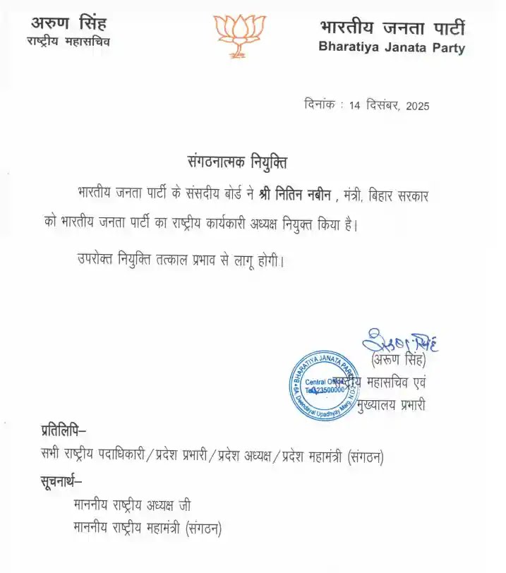 भाजपा के राष्ट्रीय महासचिव अरुण सिंह द्वारा जारी पत्र के अनुसार, भारतीय जनता पार्टी के संसदीय बोर्ड ने श्री नितिन नवीन को पार्टी का राष्ट्रीय कार्यकारी अध्यक्ष (National Working President) नियुक्त किया है. नितिन नवीन वर्तमान में बिहार सरकार में कैबिनेट मंत्री के रूप में अपनी सेवाएं दे रहे हैं।
