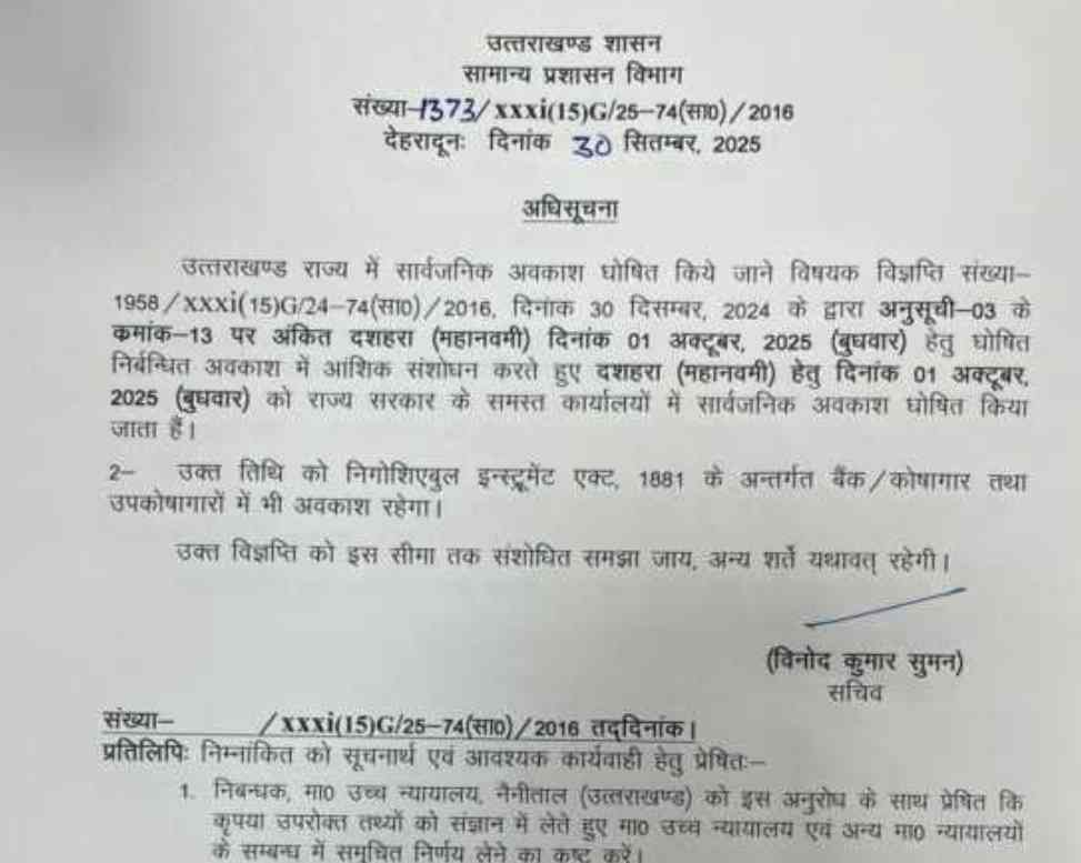 उत्तराखंड सरकार ने 1 अक्टूबर 2025 (बुधवार) को दशहरा (महानवमी) के उपलक्ष्य में राज्य के समस्त सरकारी कार्यालयों में सार्वजनिक अवकाश घोषित कर दिया है।