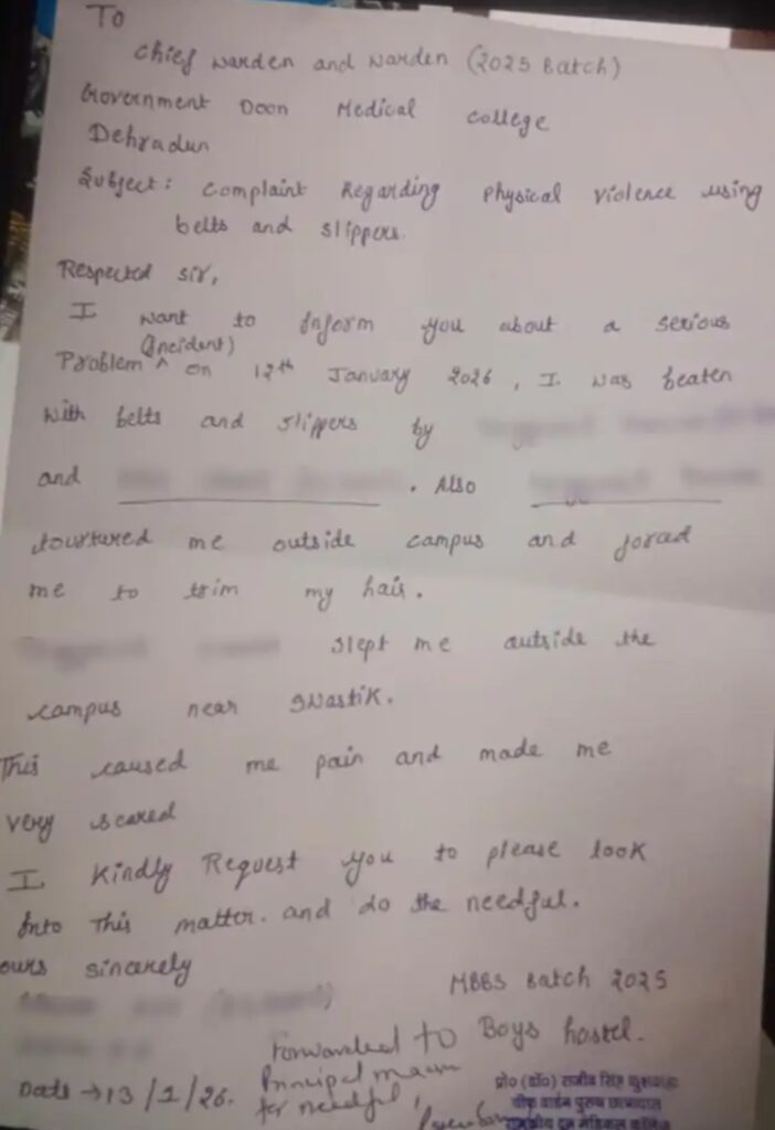 देहरादून स्थित राजकीय दून मेडिकल कॉलेज में रैगिंग का एक गंभीर और चिंताजनक मामला सामने आया है। एमबीबीएस 2025 बैच के एक जूनियर छात्र ने अपने दो सीनियर छात्रों पर रैगिंग के नाम पर बेरहमी से मारपीट करने के आरोप लगाए हैं। पीड़ित छात्र के अनुसार, उसे बेल्ट और चप्पलों से पीटा गया, जबरन बाल कटवाने का दबाव बनाया गया और मानसिक रूप से प्रताड़ित किया गया।