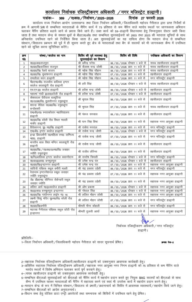 निर्वाचन रजिस्ट्रेशन ऑफिसर/नगर मजिस्ट्रेट हल्द्वानी द्वारा मतदान केंद्रवार विशेष शिविरों का रोस्टर जारी किया गया है।