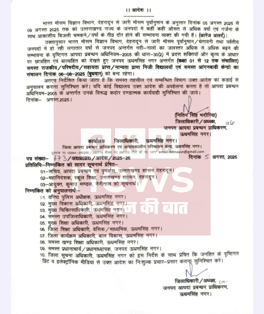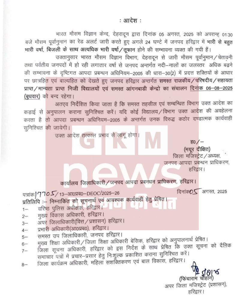 उत्तराखंड में लगातार हो रही भारी बारिश और मौसम विभाग द्वारा जारी रेड अलर्ट के मद्देनज़र राज्य के ज़िलों — चमोली, पौड़ी गढ़वाल, अल्मोड़ा, चंपावत,उत्तरकाशी, हरिद्वार, उधमसिंह नगर और पिथौरागढ़ — में 06 अगस्त 2025 (बुधवार) को कक्षा 1 से 12 तक के सभी शासकीय, अशासकीय, निजी विद्यालयों एवं समस्त आंगनबाड़ी केंद्रों में एक दिवसीय अवकाश घोषित किया गया है।