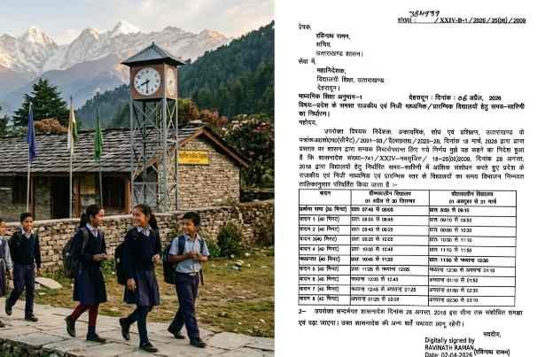 उत्तराखंड सरकार ने प्रदेश के सभी राजकीय और निजी स्कूलों के लिए नई समय-सारिणी लागू कर दी है। यह फैसला छात्रों की दिनचर्या को बेहतर और व्यवस्थित बनाने के उद्देश्य से लिया गया है।