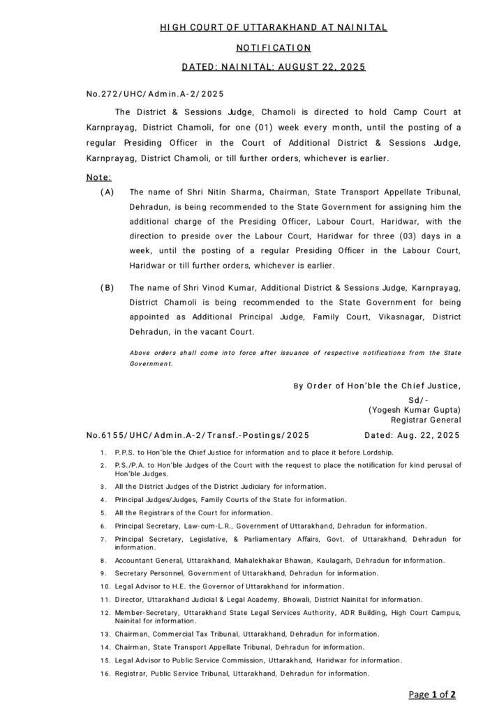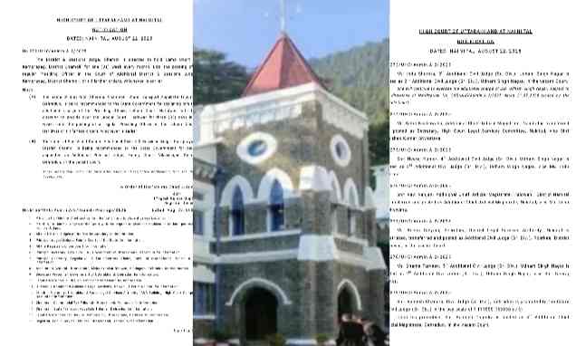 उत्तराखंड : नैनीताल उच्च न्यायालय के आदेश पर राज्यभर में बड़ी संख्या में न्यायिक अधिकारियों का तबादला एवं पदस्थापन किया गया है। उच्च न्यायालय के रजिस्ट्रार जनरल द्वारा इस संबंध में आधिकारिक अधिसूचना जारी की गई है।