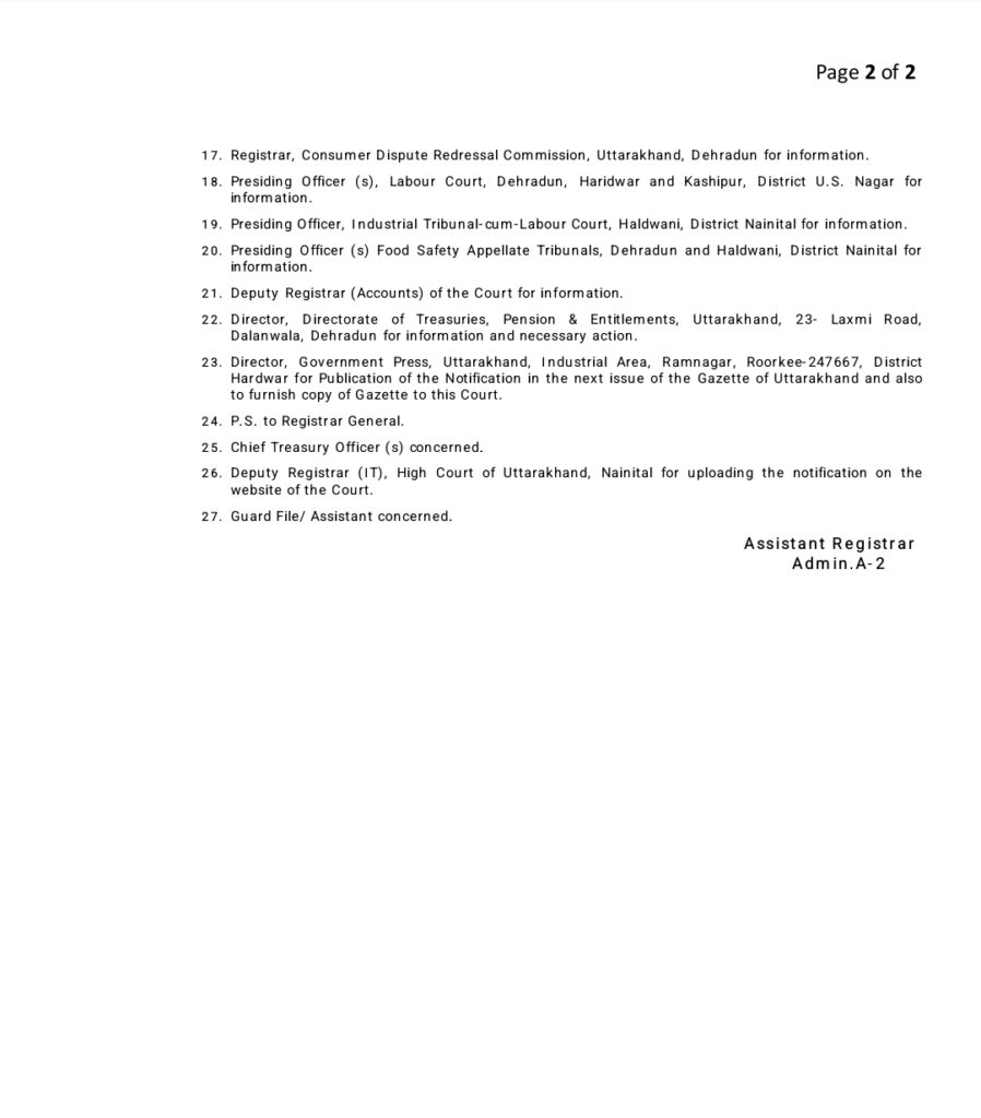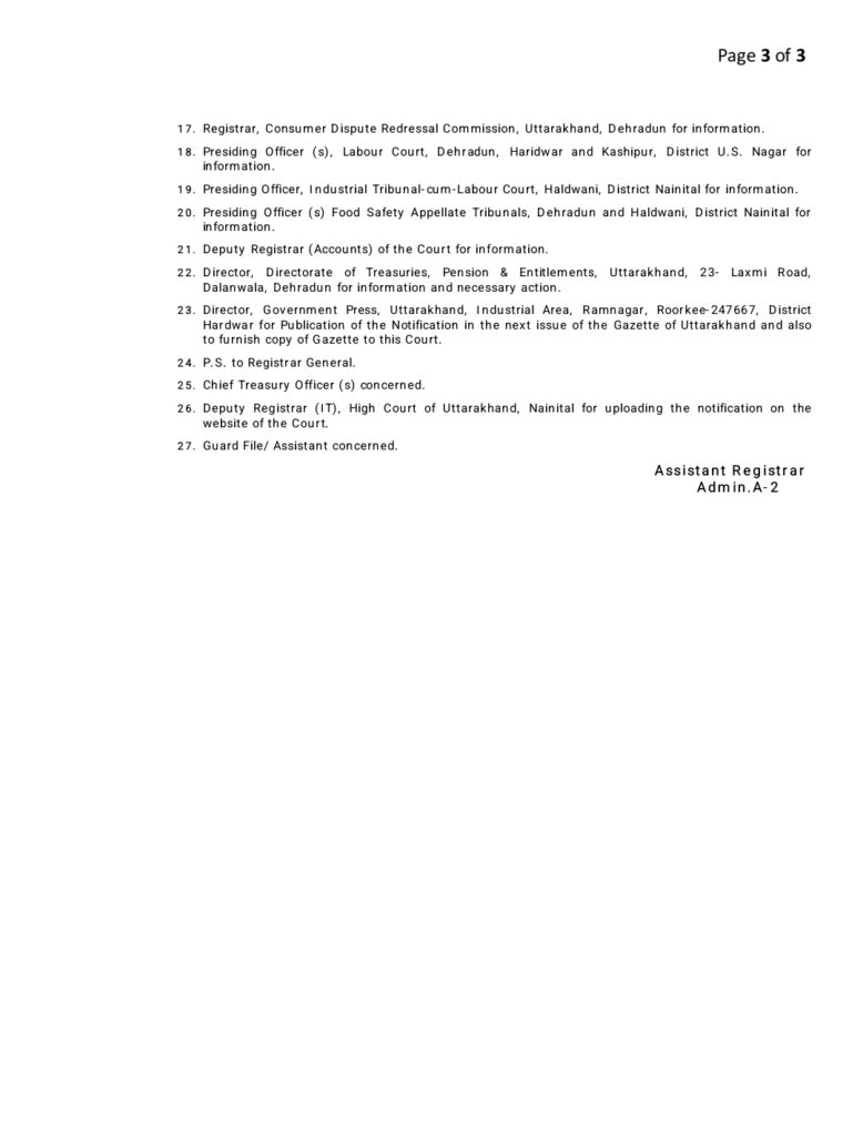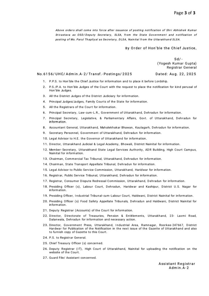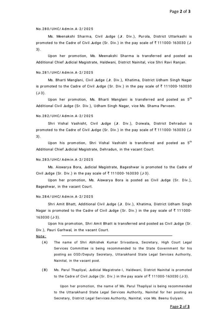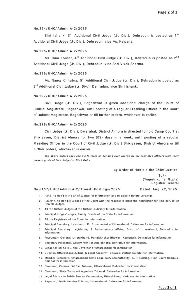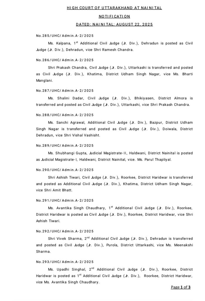 विवेक शर्मा द्वितीय अपर सिविल न्यायाधीश (जूनियर डिवीजन) देहरादून को मीनाक्षी शर्मा के स्थान पर सिविल न्यायाधीश (जूनियर डिवीजन) पुरोला जिला उत्तरकाशी के पद पर स्थानांतरित किया गया है। उपाधी सिंघल, द्वितीय अपर सिविल न्यायाधीश (जूनियर डिवीजन) रुड़की जिला हरिद्वार को अवंतिका सिंह चौधरी के स्थान पर प्रथम अपर सिविल न्यायाधीश (जूनियर डिवीजन) रुड़की जिला हरिद्वार के पद पर नियुक्त किया गया है। इशांक तृतीय अपर सिविल न्यायाधीश (जूनियर डिवीजन) देहरादून को कल्पना के स्थान पर प्रथम अपर सिविल न्यायाधीश (जूनियर डिवीजन) देहरादून के पद पर नियुक्त किया गया है। हिना कौसर चतुर्थ अपर सिविल न्यायाधीश (जूनियर डिवीजन) देहरादून को विवेक शर्मा के स्थान पर द्वितीय अपर सिविल न्यायाधीश (जूनियर डिवीजन) देहरादून के पद पर नियुक्त किया गया है।