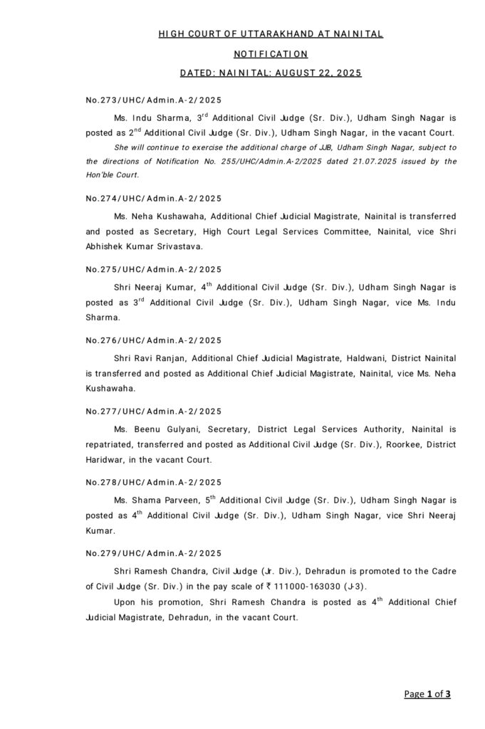 इसी क्रम में रवि रंजन अपर मुख्य न्यायिक मजिस्ट्रेट हल्द्वानी जिला नैनीताल को नेहा कुशावाहा के स्थान पर अपर मुख्य न्यायिक मजिस्ट्रेट, नैनीताल के पद पर स्थानांतरित किया गया है। बीनू गुलयानी सचिव जिला विधिक सेवा प्राधिकरण नैनीताल को प्रत्यावर्तित, स्थानांतरित और रिक्त न्यायालय में अपर सिविल न्यायाधीश (वरिष्ठ संभाग) रुड़की जिला हरिद्वार के पद पर नियुक्त किया गया है।