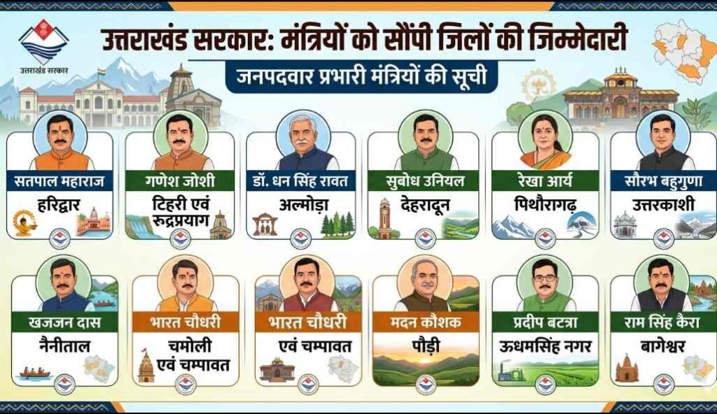 उत्तराखण्ड सरकार ने प्रशासनिक स्तर पर एक अहम फैसला लेते हुए राज्य के सभी जनपदों के लिए प्रभारी मंत्रियों की नई नियुक्ति कर दी है। नियोजन अनुभाग-1 द्वारा जारी कार्यालय ज्ञापन (संख्या: 297/XXV1/2026-एक (15)/2009) के तहत पूर्व में जारी सभी आदेशों को निरस्त करते हुए यह नई व्यवस्था लागू की गई है।