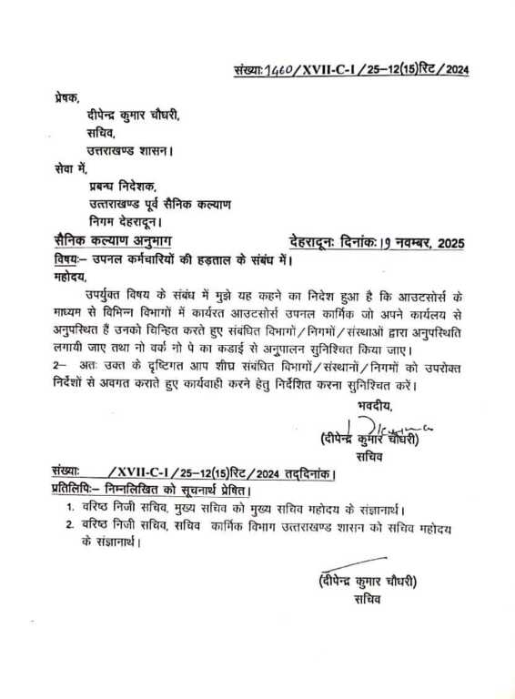 उत्तराखंड सरकार ने आउटसोर्स एजेंसी के माध्यम से विभिन्न विभागों में कार्यरत उपनल कर्मियों की हड़ताल पर कड़ा रुख अपनाया है। शासन ने सभी विभागों, निगमों और संस्थानों को निर्देश जारी करते हुए कहा है कि जो भी उपनल कार्मिक बिना अनुमति ड्यूटी से अनुपस्थित हैं, उन्हें तत्काल चिन्हित किया जाए और उनकी अनुपस्थिति दर्ज की जाए।