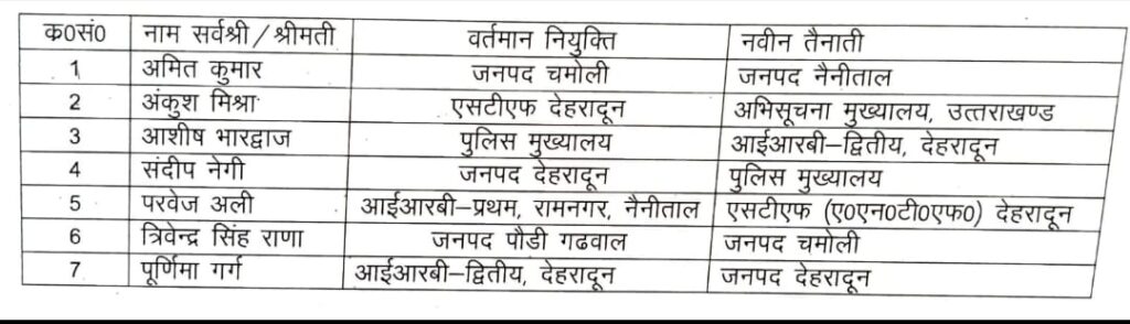 4.संदीप नेगी, जो जनपद देहरादून में कार्यरत थे, अब देहरादून पुलिस मुख्यालय में सेवाएं देंगे।